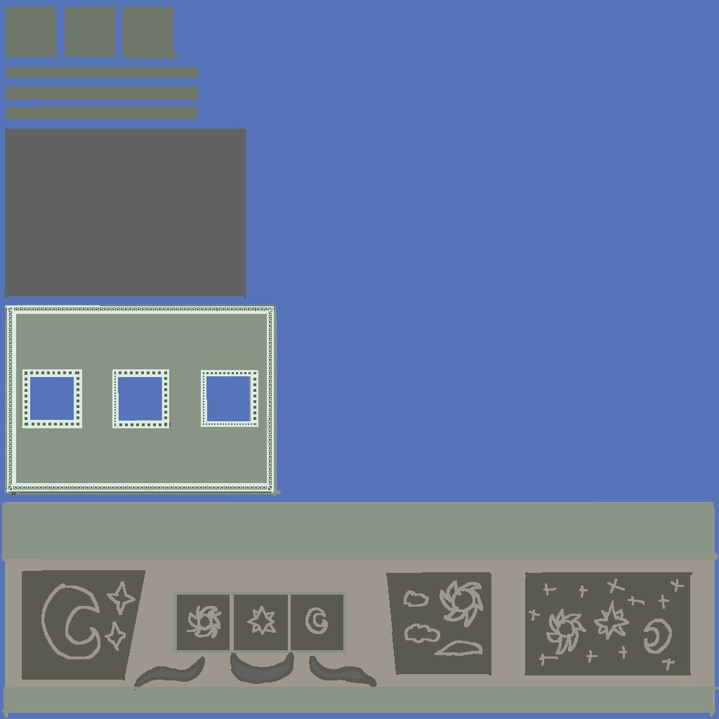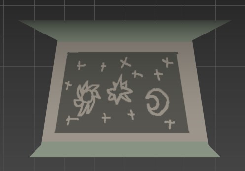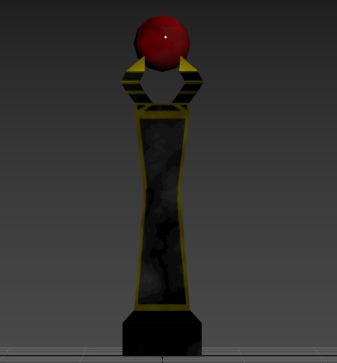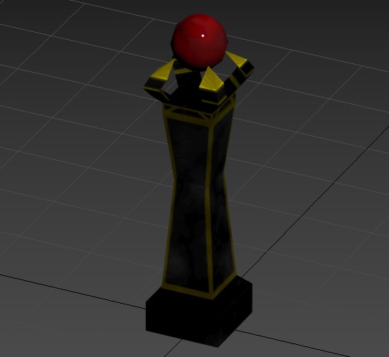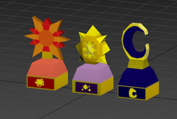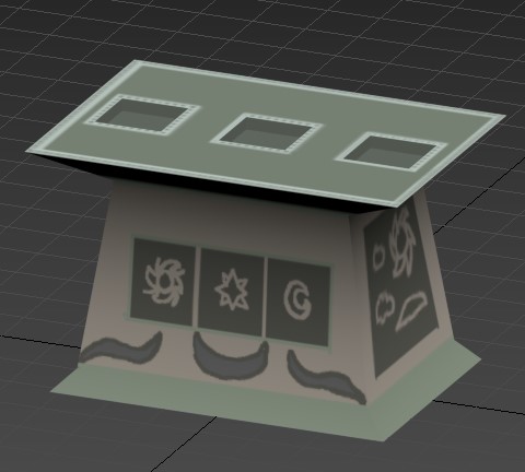 These are the three statues and podium I made while working on Eden. The player would collect each statue after completing each of the puzzles in the game and then place them on the podium in order to leave the ruins. Cooper told me to make three statues and a podium, and left theming up to me. I decided to go with an astral theme with the three statues being a sun, moon, and star. I thought this made sense as astral bodies are often associated with magic and witchcraft. The podium needed to be able to hold all three statues, and fit the theming of an underground ruins as well. All models were made in 3ds Max, and textured in Adobe Photoshop.